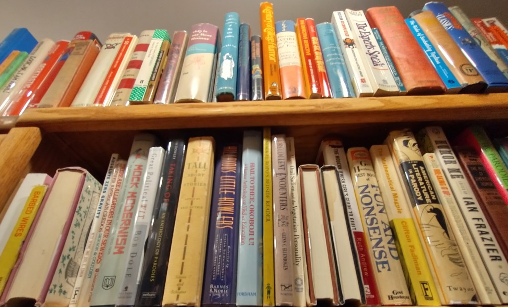 But my special niche is books. I collect books. So I collect humor. Obsessively. Books of humor, about humor, examining humor, anthologizing humor, honoring humor. Books written to make people laugh, to tell the stories of the people who make others laugh, to study what makes people laugh. Books by and about the great names in the field, plus hundreds of lesser names and names who have been utterly forgotten. I have a literal library’s worth of humor, thousands of books, bookcases up to the ceiling and under windows and tucked into closets.