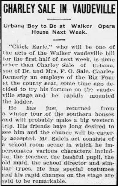 Possibly not wanting to wait for the statue until 1959, Sale’s family soon moved to the literally more urbane precincts of Urbana, IL, home of the University of Illinois, which Sale would later claim to have attended. Nevertheless, the lad enjoyed a “Tom Sawyer” life, surrounded by rural characters whose foibles, escapades, and speech patterns he committed to memory and reenacted in lectures and vaudeville, from his teenage years to his early death. His act consisted of what then were called “agricultural types,” some teachers, some students, some old men telling stories about the glories of the Union Army. He soon made a name for himself: Chick Earle. The earliest newspaper story I’ve found shows Sale, a vaudeville veteran at the age of 23, slipping into the news on September 19, 1908, as “Chick Earle character impersonator, making twelve complete changes in wardrobe.” This was very far from the bright lights in the big city, out in Marion, OH. The featured act was Deblaker’s dog and monkey circus.