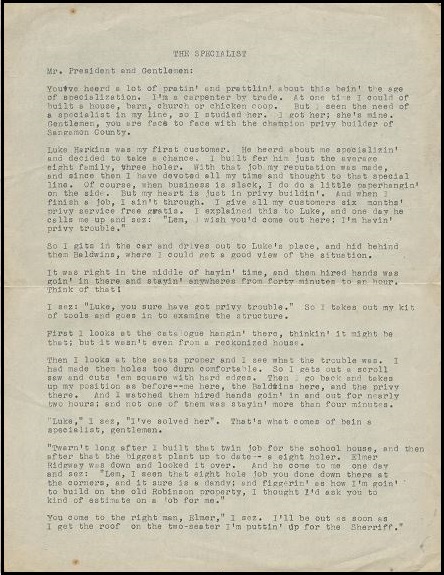 Where in all this biography is the print humorist who would sell millions? Where did Sale come up with a monolog that was so risque that he could only tell it to male audiences, although it was also so clean that not a single word could be censored? For in the radically different world before WWII, the mundane subject of building an outhouse was so forbidden that creating a “specialist” who designed them keeping in mind all the faults and foibles of the very human users who would inhabit them, however briefly, caused howls of laughter.
