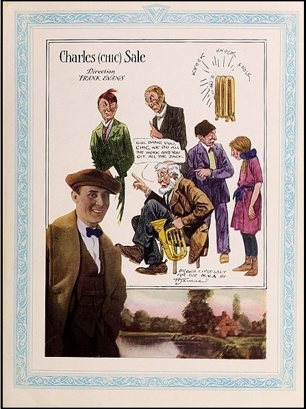 Sale always maintained that he never invented any of his many characters, but just took the people he knew and adapted them for the stage. Maybe something about being home convinced him that he needed to be himself instead of a made-up character. Whatever the reason, that appearance in Urbana is the last time newspapers record the vaudeville career of Chick Earle. Back in Ohio two months later, in May 1909, Chic Sale – “the impersonator” – makes the first of thousands of appearances in the news. Always swimming against the tide, Charley Sale must be the only actor who became a star after changing his stage name back to the one he was born with. His official onstage designation was always Charles “Chic” Sale, but gladly answered to just Chic, while Charley became Charlie.