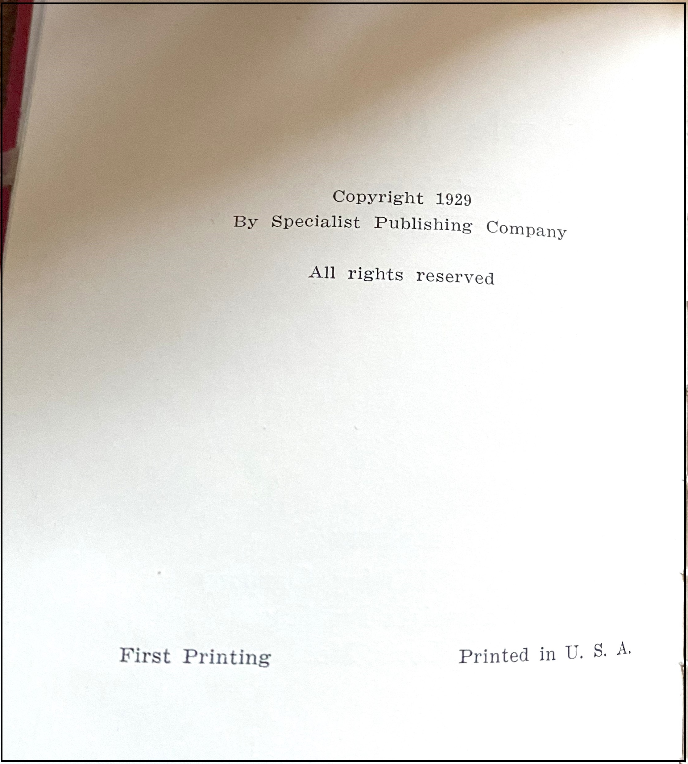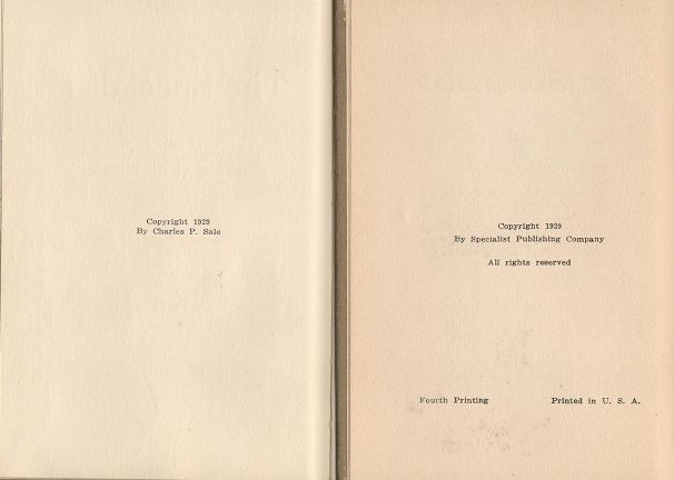 Another giveaway is that the earlier edition is copyright to “Charles P. Sale,” but later printings assign the copyright to the “Specialist Publishing Company.”