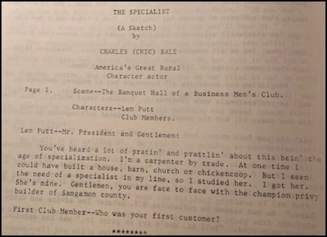 Not likely. In fact, The Life details how careful Sale was not to use the story in his act, but practice it as he told it to men’s clubs, and small gatherings, and – at invitation-only parties – to men and women alike. It wasn’t until “the early twenties” that actor Frank Bacon urged him to take it public with an enthusiastic “You’ve got something there, Chic.” Sale “built the story, paying the same attention to detail that Lem had paid in constructing his small building.”