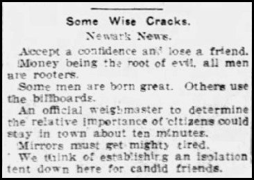 Aside No. 1: In fact, O. O. McIntyre, a widely syndicated New York newspaper columnist, claimed in his August 15, 1923 column that Sale coined the word “wisecrack.” Or maybe just was the first to use it on stage. In his May 2, 1926 column, McIntyre says Sale first heard it in front of a livery stable in the middle west. “One of the loafers pulled a pun. Another chortled and exclaimed, ‘There’s a wise crack for you’.” McIntyre loved Sale; he wrote the “Introduction” to Sale’s second book. Whenever he couldn’t think of a way to pad out his column, he included this factoid.