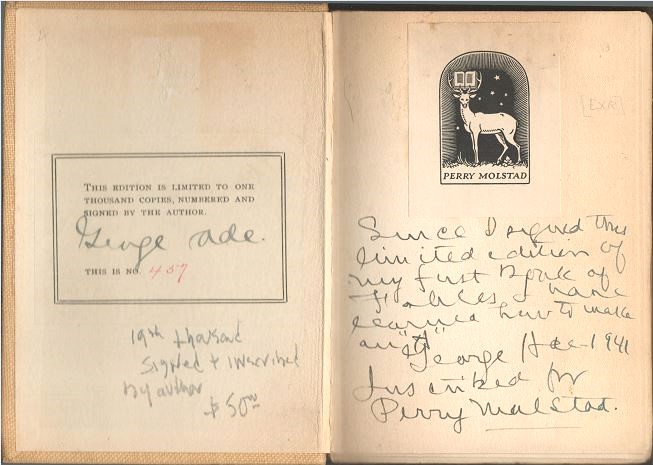 As a daily columnist he had a huge backlog of product to disseminate. The second book, More Fables, also came out in 1900. I had the luck to pick up a copy not only signed by Ade but also signed and with a fabulous pen and ink drawing by illustrator Clyde J. Newman. A third, even larger, collection, Forty Modern Fables, also appeared in 1900. (To be precise and pedantic, Fables in Slang was released in December 1899. but the bulk of sales took place the next year.)