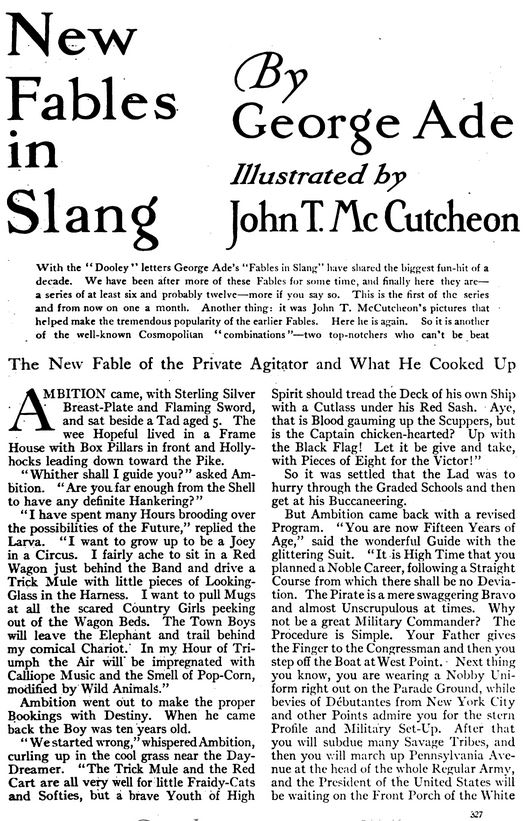 Thanks to Google those issues are now digitized, and the content has gone into the public domain. Here’s the return of George Ade with new Fables in the August 1912 issue, illustrated, of course, by John T. McCutcheon.