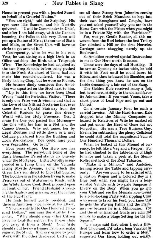 Ade left Chicago for New York, the country’s center of theater, even more then than now. With one hand he churned out Fables and with the other from 1902 through 1910 he wrote nearly a dozen plays, light operas, and musical comedies. Just as Andrew Lloyd Webber made a billion dollars from musical theater, Ade made his big money from his stage work. Forgotten today as they might be, in the early 20th century plays dwarfed his Fables in the number of twenty-dollar bills thrown at his face. Ade earned something like $5000 per week at his peak and got dubbed The Baron of Broadway. Well, a biographer titled a chapter that way, but that’s still pretty good. I’d take it.