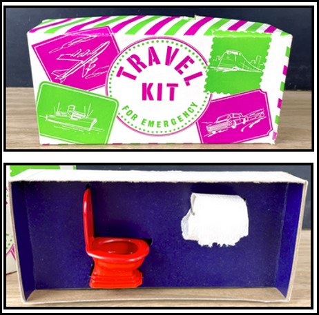 Gag boxes were the logical descendant of funny greeting cards, only in 3-D. What the front of the box said it contained was merely a lure; when opened the recipient saw that while the claim was literally accurate the interior was wholly unexpected. Gag boxes preceded the Fishloves but Irving pounced on the idea, especially after 1924, when TootsieToy started making injection-molded plastic toilets for dollhouses. Here’s a more modern example that shows off the concept perfectly.