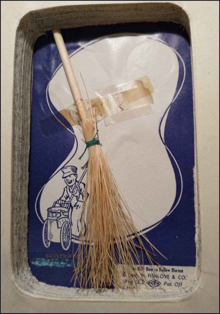 A maniac Fishlove collector could probably spend years tracking down all the variants the company issued. I know of ten, all using different books as props. The earliest books were school readers from the 1920s, sure candidates for extermination, the later ones regular trade editions of titles that seemingly never sold well. The brooms stayed the same from beginning to end but the shovels varied in color. In addition to the black one above, I’ve seen green, silver, gray, white, and red versions, although I don’t have them all.