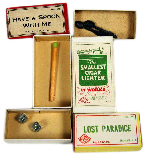The hollow books seem to fade out by the mid-1950s, although more titles might be found at any time. Fishlove thrived in that decade, gag gifts going from a gentleman’s snigger to a universal – usually clean – jokes for all ages. Chattering Teeth and the fake vomit sold as “Whoops!” are both creatures that appeared in catalogs marketed to adults and ads in comic books in the 1950s. Toilet jokes faded away, according to the Timms, because of the decade’s conservatism. Yet the industry, always aimed at men and boys, now served up a dubious step toward gender equality, with products aimed at women like the spoons with holes in them marketed as diet aids.