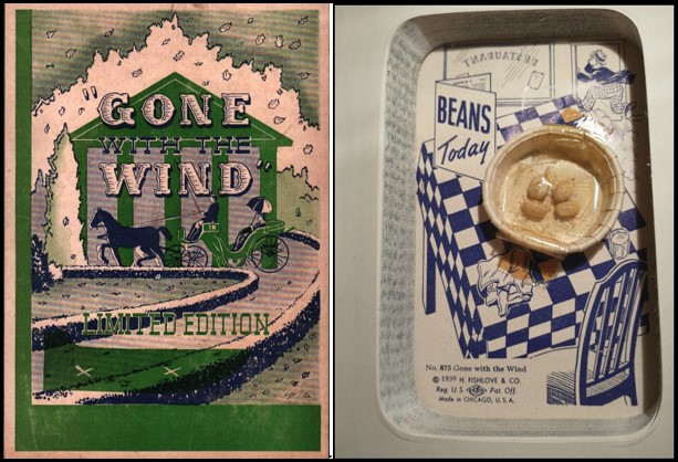Sorry, that’s another bathroom humor joke, playing on the propensity of beans to make you toot. The timing is far more interesting. Gone with the Wind was the smash hit giant movie of 1939. At the bottom of the tablecloth is Fishlove’s info, “No. 875 Gone with the Wind/©1939”. My hunch is that Fishlove rushed this gag out to ride on the movie’s fame, even putting “Limited Edition” on the cover to get people to buy right away before another flood of movies swamped its familiarity. No author is mentioned anywhere, but apparently the title remained potent enough for a much later reprinting.