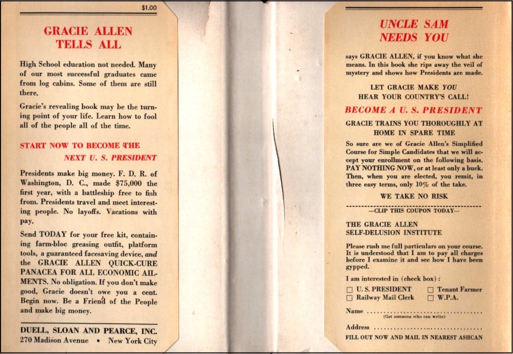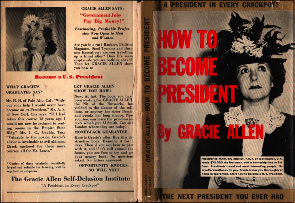 Oh yeah, there was a book, too, How to Become President, issued by the Gracie Allen Self-Delusion Center, illustrations by Charles Lofgren. Author to this day unknown, as well he should be. At 96 pages, 22 blank or with full-page drawings, it barely had more material than Cantor’s and was probably ground out in even less time. Gracie’s humor rested almost entirely on her screwball, scatterbrained, or dizzy answers to George’s questions. The book removed George and left the answers, a poor imitation of what made Gracie irresistibly endearing. It remains one of the few humor books in which the dust jacket is far funnier than the interior.