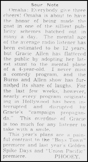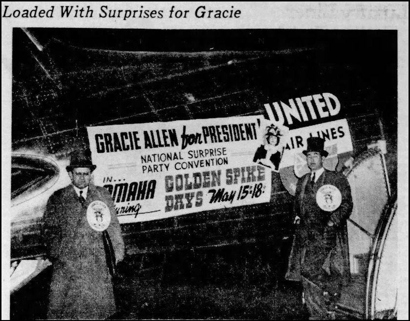 To promote the release of the movie Union Pacific [in 1939], the railroad [the Union Pacific] and the city [Omaha] had staged an Old West festival called Golden Spike Days, during which the men of Omaha grew beards and everyone wore traditional costumes. Golden Spike Days had been such a successful tourist attraction that Omaha had decided to repeat it. The Union Pacific Railroad offered to provide a campaign train for Gracie for a whistle-stop tour, and Omaha volunteered to host her nominating convention.