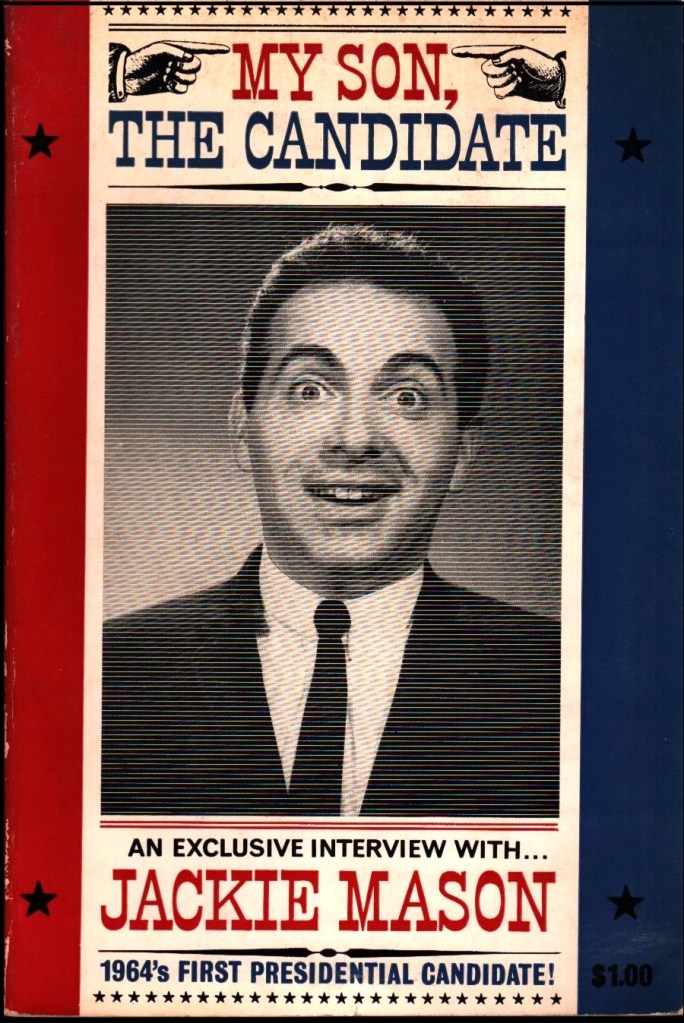 The collective vacuum surrounding the book, leaves one question remains unanswered. Who wrote My Son, the Candidate? Like Cantor, Mason wrote (or co-wrote or put his name on) a number of humorous books using real prose. He may similarly have written, co-written, or had no hand in writing this book. The book’s title, for those not up on early 60s popular culture, was undoubtedly meant to play off of the three number one albums Jewish satirist Allan Sherman had released in 1962 and 1963: My Son, the Folk Singer, My Son, the Celebrity, and My Son, the Nut. One clue may lie in the copyright, which is to Jackie Mason and Bill Adler. Adler was a professional book packager. He spun off ideas and found people to write them out and publishers to put them in print. Whether he just convinced Mason to put his name on a book to which Adler contributed all the work, or Mason provided the jokes himself is unknown.