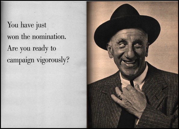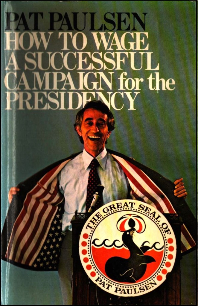 Pat Paulsen obviously did not win the presidency on November 5, but running for President was such a great, lucrative, and self-promoting gig that Paulsen campaigned again in 1972, 1980, 1988, and 1992, surpassing Yetta Bronstein’s record. And even in 1996, though he was so ill that he would die the next year. Franklin Roosevelt ran for four terms; Paulsen knew he was following a great tradition. Besides, Paulsen knew he had what most small-time actors dream of: a great, well-paying gig, the first stand-up politician. So much so that in 1972 he released a virtually unknown companion book. How to Wage a Successful Campaign for the Presidency – the title riffed probably unknowingly on Gracie Allen’s How to Become President – gave little useful advice on the subject, but is by far the best of all the campaign books, still funny after all these years and horrifyingly still relevant.