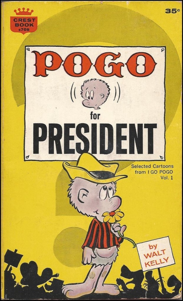 Newspapers eventually gave away 2,000,000 I Go Pogo buttons. (The slogan was a play on I Like Ike, the slogan used by enthusiasts for Dwight “Ike” Eisenhower. Jimmy Durante, as noted above, did the same gag, but Kelly got there first.) Pogo and I Go Pogo sold 100,000 copies in 1952. The book – reprinted abridged in 1964 with the more straightforward title of Pogo for President – ended with the swamp residents chaotically heading off to Chicago for an unnamed convention, leaving behind a blissfully napping Pogo. (In an equally blissful happenstance, both the Republican and Democratic conventions were held in July in Chicago, so no one could accuse Kelly of favoring a party.)