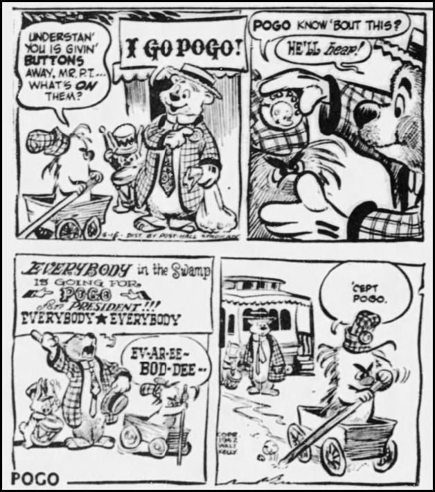 Kelly’s strip became a college craze, the way Doonesbury did two decades later. A full 50,000 I Go Pogo pins were distributed to 30 colleges at the same time P. T. Bridgeport started handing them out in the strip. (Campaigns provided such fodder for satire that new pins were handed out in 1956 and 1980.)