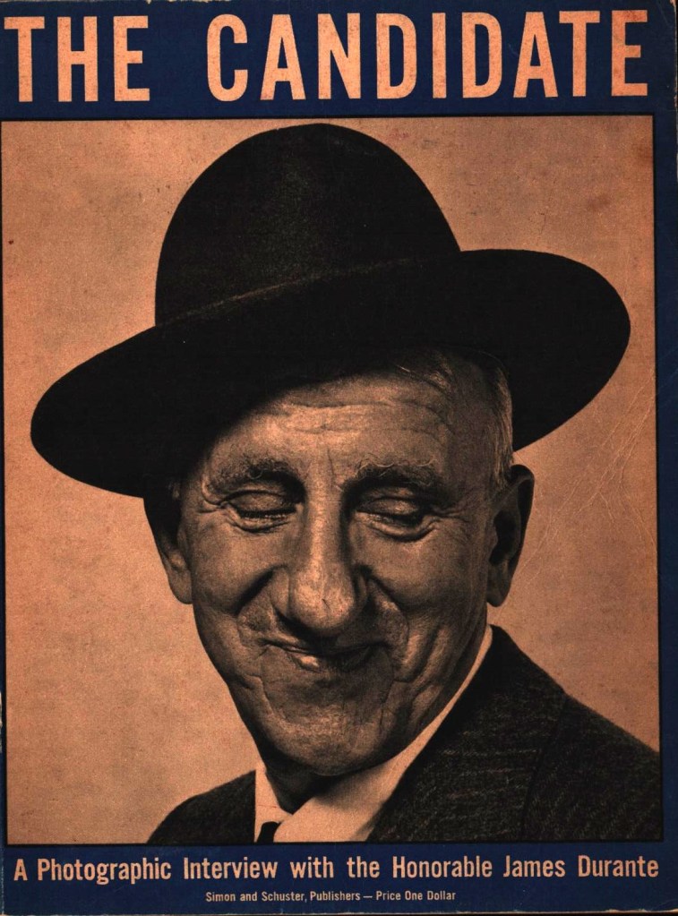I wish I had more information on the book, but neither of the two biographies issued later than Fowler’s mention The Candidate, nor do any contemporary newspaper articles explain its origin. Doesn’t matter. Jimmy Durante, old trouper that he was, knew publicity as well as George Burns. Posing for a few pictures merely ticked one more box alongside his endless fight for enduring fame.
