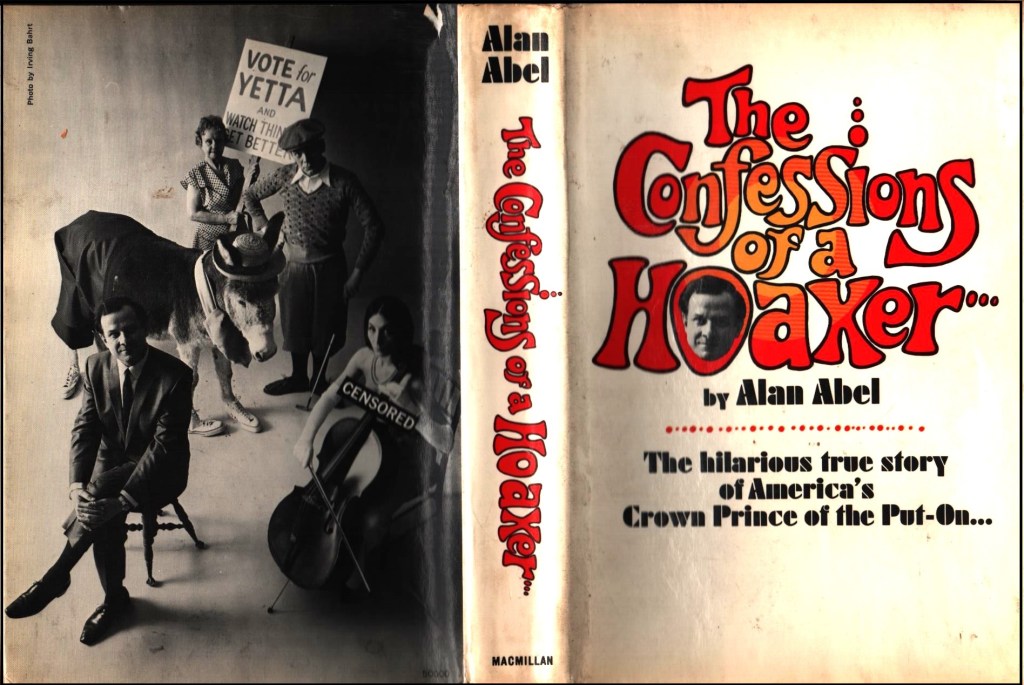 Don’t remember Alan Abel (1924-2018)? He was the country’s first and probably only professional hoaxer. At least I’ve never been able to figure out what he did as a day job. His life was a series of hoaxes, bolstered by books and fake documentaries. His specialty was creating the most absurd situations and presenting them completely straight-faced, building on real events of almost equal absurdity. Abel could stand before any audience or appear on on any tv show and convince large swathes of the public with his apparent complete sincerity. The Society for Indecency to Naked Animals (SINA) [note that the name contradicts its intent; somehow only a few columnists recognized this at the time], denounced the danger to children of animal genitalia, conveying general 1950s fears perfectly, although I’m sure that it would spark equal national hysteria today. (A young Buck Henry, later a noted comedian and writer, initially appeared as SINA’s president, although Abel later touted the group himself.) Abel played both sides. After New Wave clothing like Rudi’s Gernreich’s topless bikini made headlines, Abel made some of his own, hiring four models to pose nude to the waist. The World’s First Topless String Quartet never played a note – the models had no idea what to do with the instruments they were holding – but people swore they had seen them in concert.