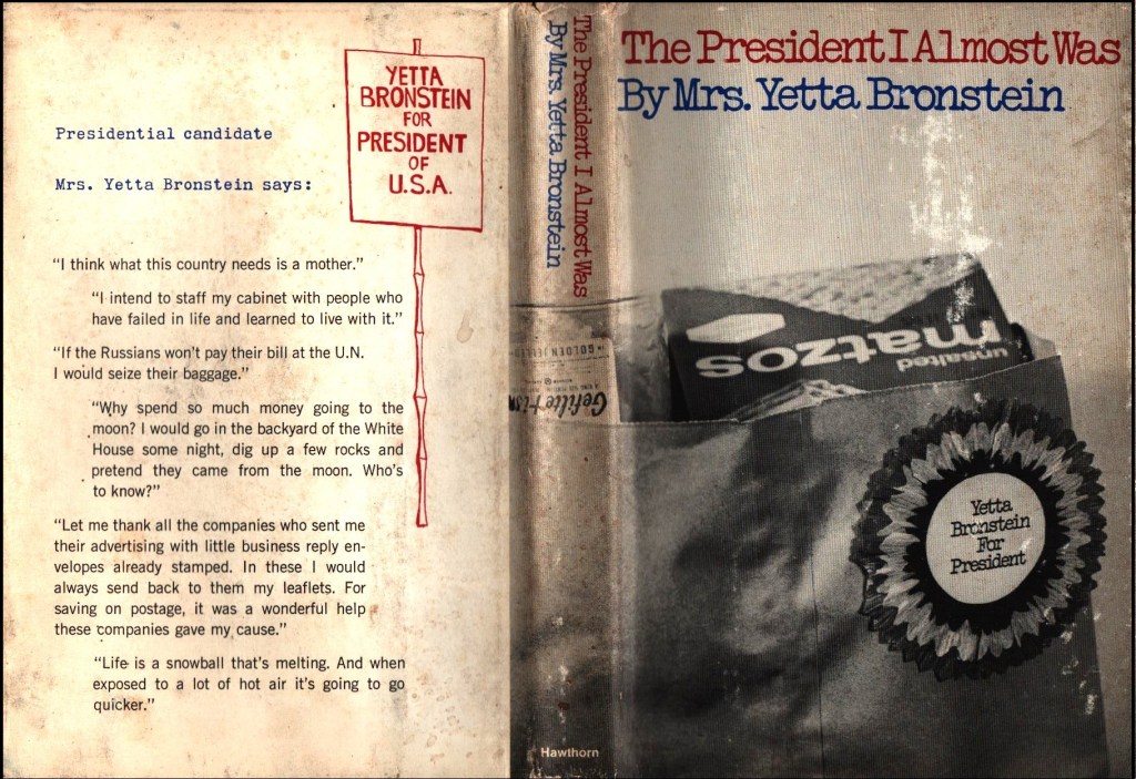 Let’s start at the beginning. In early 1964, Yetta – her first name was her image – started calling into Alan Abel’s Playboy radio talk show about her campaign, proclaiming that what the country needed was a mother in the White House. He wrote about this in 1970.