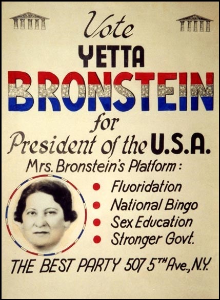 Think today’s elections are chaotic? At the 1964 Democratic National Convention in Atlantic City, a small group touting the Best Party, an independent try for President, were removed from their spot by the police. They were nice about it, though. “[The Nazis] have so many people here that we just have to push you down a little to keep the traffic moving” said a a state cop. The group, carrying signs reading “With Yetta, Things Gotta Get Betta,” complied, as minimal a presence as the last marchers in a Fifth Avenue parade. Yet the press noticed, thanks to the campaign manager’s vigorous and astute handling of them. Candidate Yetta Bronstein may not be a familiar name today but that’s not the fault of the national newspapers who passionately covered her presidential campaign in 1964. And again in 1968.