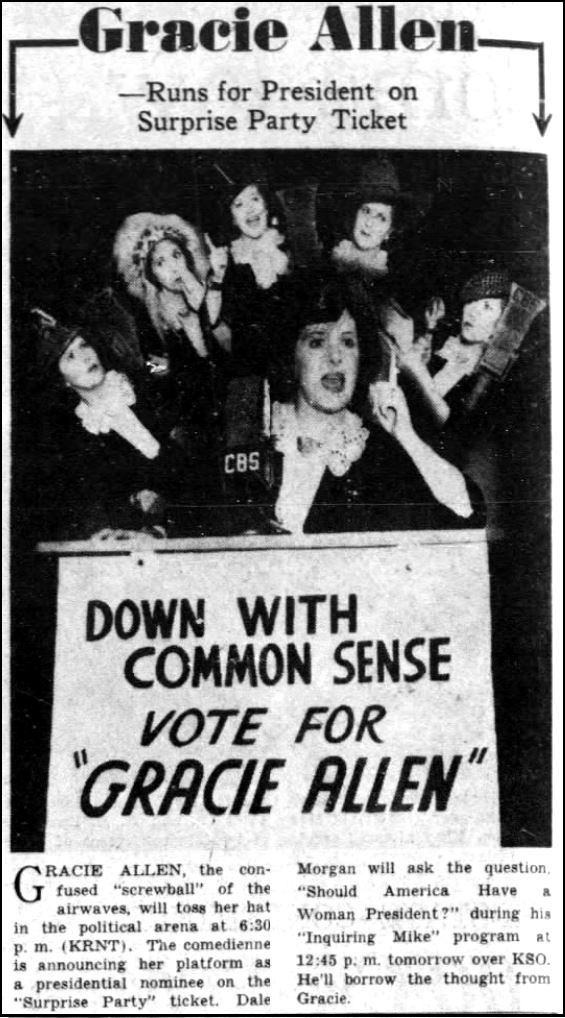So in 1940… Burns was stumped. He met with his writers every week to create the next show’s script and the premise was always “Gracie does something crazy.” Their best idea was “Gracie learns opera,” as announced in a January newspaper. That didn’t last long. In I Love Her, That’s Why, a forgotten biography from 1955, George claimed a writer complained, “She’s done everything but run for President of the United States.” After giving the writer a raise, George incorporated the gag into the program, scheduled to occupy space for two shows. Gracie did Gracie-isms, like dodging the third term controversy by proclaiming that she would do her third term first to get it out of the way. And she would run as the Surprise Party.