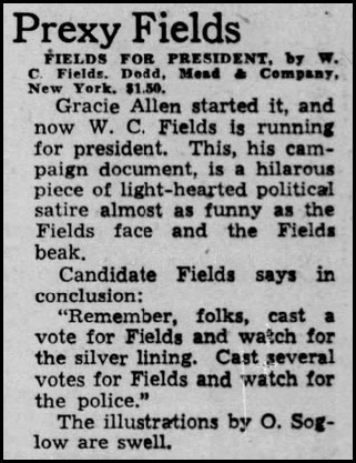 We can’t leave 1940 without reporting on the other famous comedian throwing a hat into the ring for President. In the already established tradition of oddness, this one featured a book but no campaign at all. In fact, the book barely mentioned the Presidency. And the candidate was only slightly less likely a figure than Gracie Allen. I present to you W. C. Fields for President.