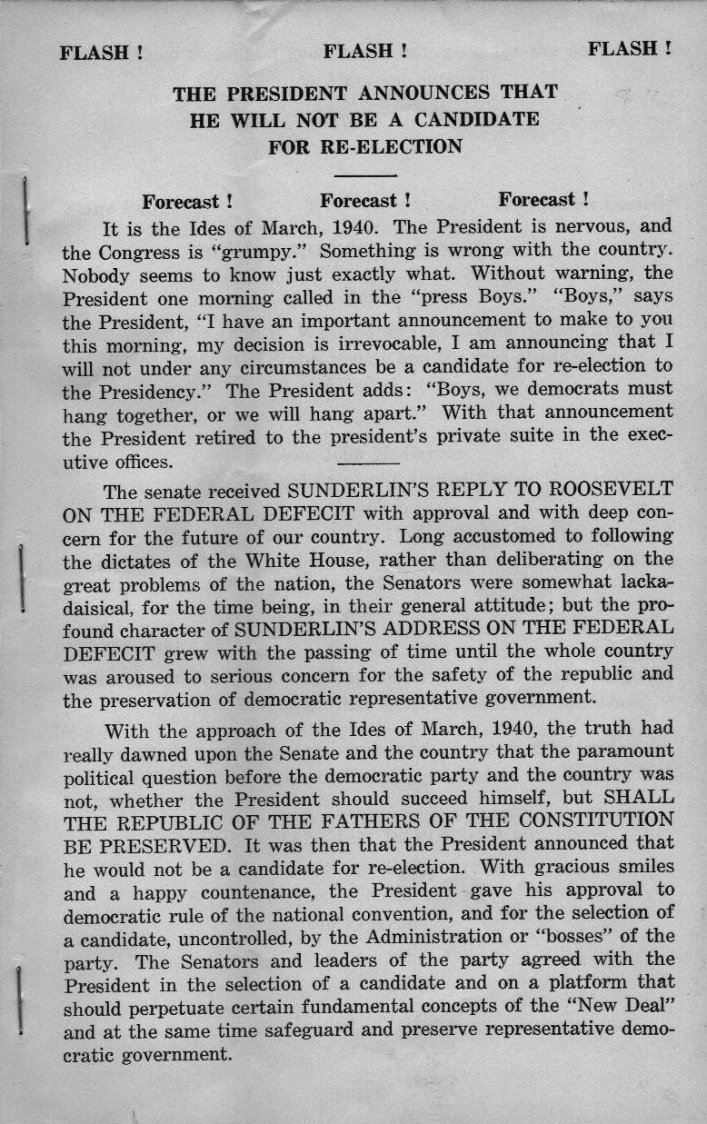 How else can I explain the untitled half-a-sheet-of-paper-sized stapled set of nine numbered pages with the heading “FLASH! THE PRESIDENT ANNOUNCES THAT HE WILL NOT BE A CANDIDATE FOR RE-ELECTION”? The President is Franklin Roosevelt, announcing on the Ides of March 1940 that he not will run for a third term, necessitating a contested convention. You will not be astonished to learn that, after a long satiric speech by then Vice President John Nance Garner to the assembled Senate, the writer of this little playlet is named by acclamation to be be the Democrat’s 1940 candidate for President.