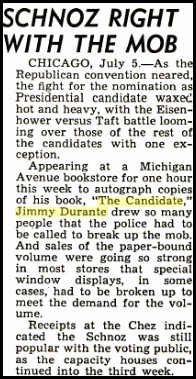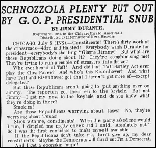 If Durante’s name and picture weren’t enough to sell an inexpensive oversized paperback, Durante doubled down by doing double duty. He cunningly showed up to do a week of his act in Chicago during the Republican convention, then filled with delegates torn between Eisenhower and Senator Robert A. Taft. To mark his visit – and promote his book – a daily piece under his name, undoubtedly written by a press agent or someone similar and datelined from the convention, was syndicated across the country.
