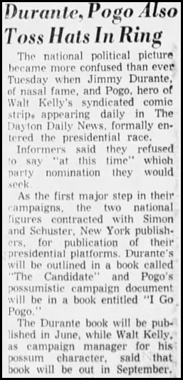 If you think it would not be possible to put out a campaign book with less original content than Fields’, you don’t understand the world of publishers. 1952 was another of those years in which candidates, particularly Dwight Eisenhower, were playing coy about running. With no candidates anointed before the summer conventions, the field was open for publicity stunts. Publisher Simon & Schuster perhaps understood this better than anyone else at the time. They choose the two humorous candidates with the widest appeal for President. Jimmy Durante and Pogo Possum.