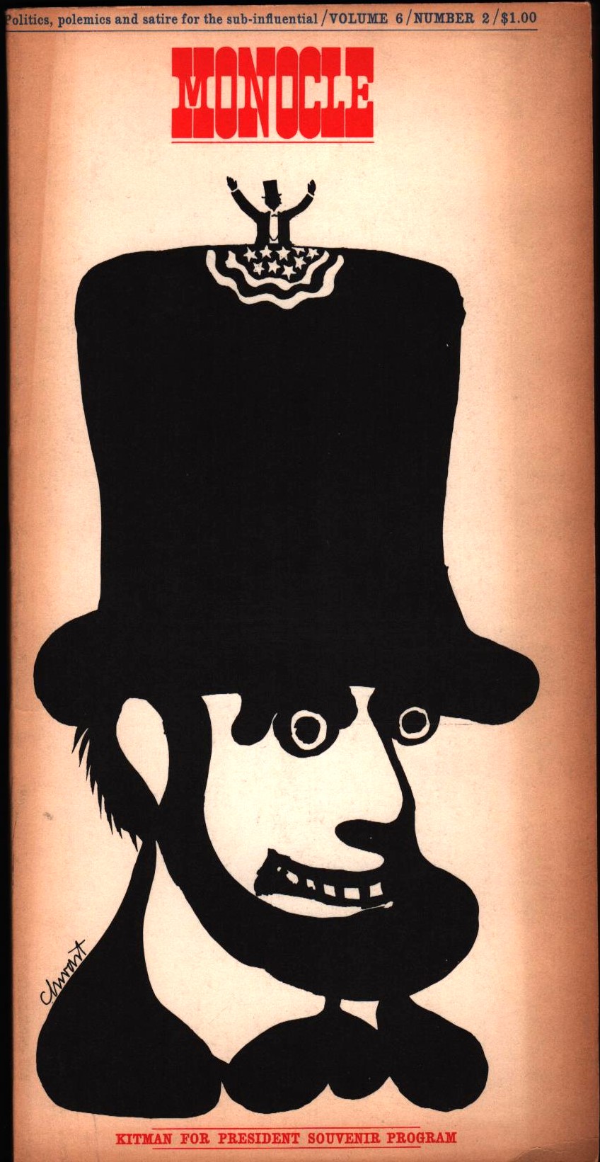 Monocle staggered as well, dying in 1965, but not until publishing a “Kitman for President Souvenir Program” as their Fall 1964 issue. It is almost entirely comprised of clippings of letters and newspaper stories about the mock campaign, making a staggeringly thorough historic document of the back rooms of a campaign. Tragically, most political historians have chosen to ignore this trove of history. To be fair, that’s possibly because the program was printed only in a batch of 100 copies, of which mine is numbered 23. Several are available online, though, a suspiciously large number for such a small printing. Is it another joke? Yes. I have two copies, both numbered 23. Collectors beware.
