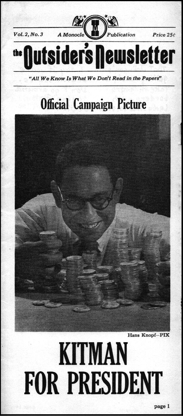 The press climbed all over Kitman, some of them loving the joke, some of them not quite getting it. College students got it. Young Republican clubs proclaimed him their candidate. Playboy devoted a full page to a mock interview. When the votes were counted in New Hampshire, the Secretary of State certified that his delegate received 638 votes, although every paper, including Monocle, reported differing numbers, with Monocle finally settling on 725 of some 93,000 votes. Losing caused Kitman to suspend his campaign, denying that he was ever a candidate, although he kept doing press, like a $1 a plate fundraising dinner, for another month.