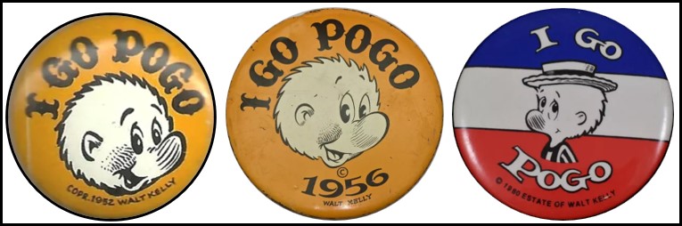 Kelly’s strip became a college craze, the way Doonesbury did two decades later. A full 50,000 I Go Pogo pins were distributed to 30 colleges at the same time P. T. Bridgeport started handing them out in the strip. (Campaigns provided such fodder for satire that new pins were handed out in 1956 and 1980.)