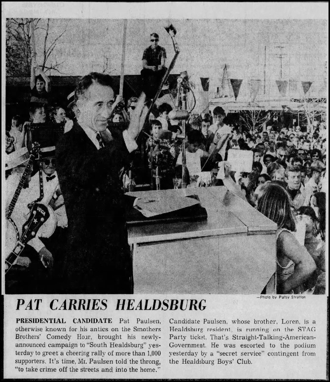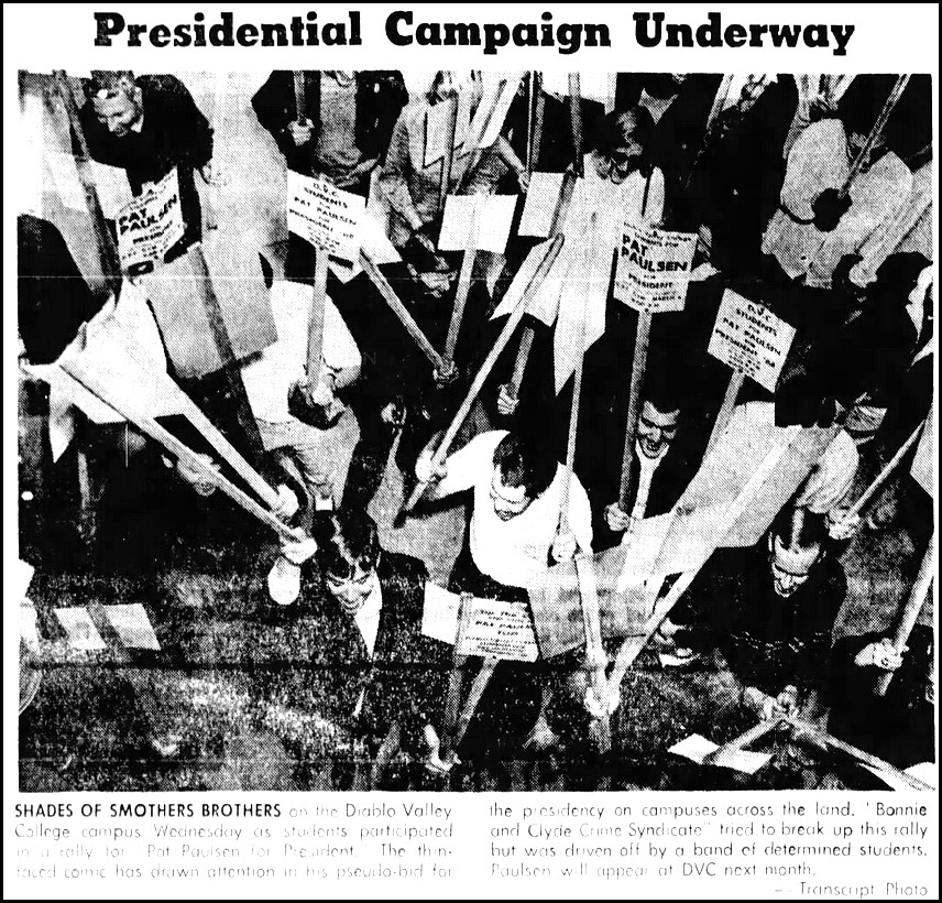 Paulsen’s candidacy/non-candidacy finally culminated in season 2 with an announcement on the March 3 show, which was just before the Smothers’ odd-length season ended. By that point Paulsen was heavily campaigning, at least within commuting distance of his Los Angeles base. As with Pogo, Yetta, and Kitman, collegians swarmed to Paulsen.