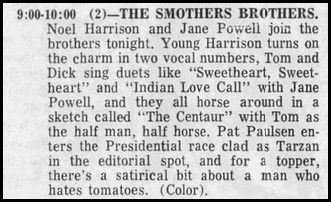 Then Lyndon Johnson declared he wasn’t running for re-election on March 31 and the political world went nuts, just in time for the Smothers’ summer vacation so neither they nor Paulsen could comment on national television. Coincidence? I think not.