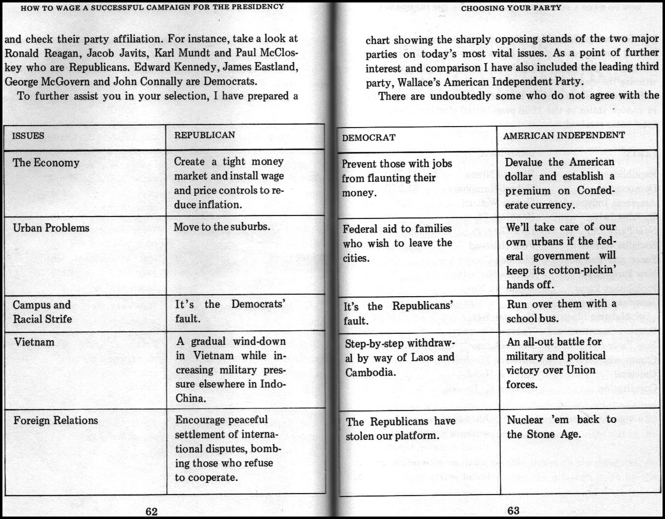 Pat Paulsen obviously did not win the presidency on November 5, but running for President was such a great, lucrative, and self-promoting gig that Paulsen campaigned again in 1972, 1980, 1988, and 1992, surpassing Yetta Bronstein’s record. And even in 1996, though he was so ill that he would die the next year. Franklin Roosevelt ran for four terms; Paulsen knew he was following a great tradition. Besides, Paulsen knew he had what most small-time actors dream of: a great, well-paying gig, the first stand-up politician. So much so that in 1972 he released a virtually unknown companion book. How to Wage a Successful Campaign for the Presidency – the title riffed probably unknowingly on Gracie Allen’s How to Become President – gave little useful advice on the subject, but is by far the best of all the campaign books, still funny after all these years and horrifyingly still relevant.