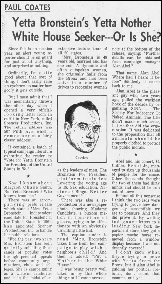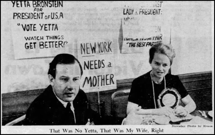 Abel slithered around that limitation by spending five dollars a month to rent a literal storage closet in a tony Fifth Avenue building. He listed The Best Party – as in voters should vote for the best party – on the lobby directory, although reporters always encountered nothing but a locked door. Abel did occasionally drop by to pick up the accumulated mail and change the tape in the answering machine for a series of messages recorded by Jeanne as Yetta. Publicity stunts with friends or enthusiastic collegians as supporters kept Yetta’s name in the news. He leaked the story to syndicated columnist Paul Coates, who revealed the hoax and hoaxer to the entire country. Papers kept reporting on Yetta regardless, treating her as just one of the many weirdo candidates that populated every election. I hope Coates’ ego wasn’t bruised by being ignored.